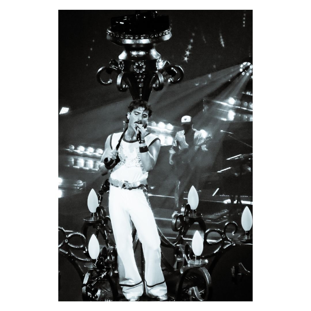 Boone também busca referências vocais em Freddie Mercury, do Queen, espalhando sua voz de múltiplas oitavas em músicas como “Man in Me” — cheia de emoção — e na balada delicada ao piano “In the Stars”, apresentada sobre um piano azul, na ponta de uma passarela que se estendia por toda a arena.